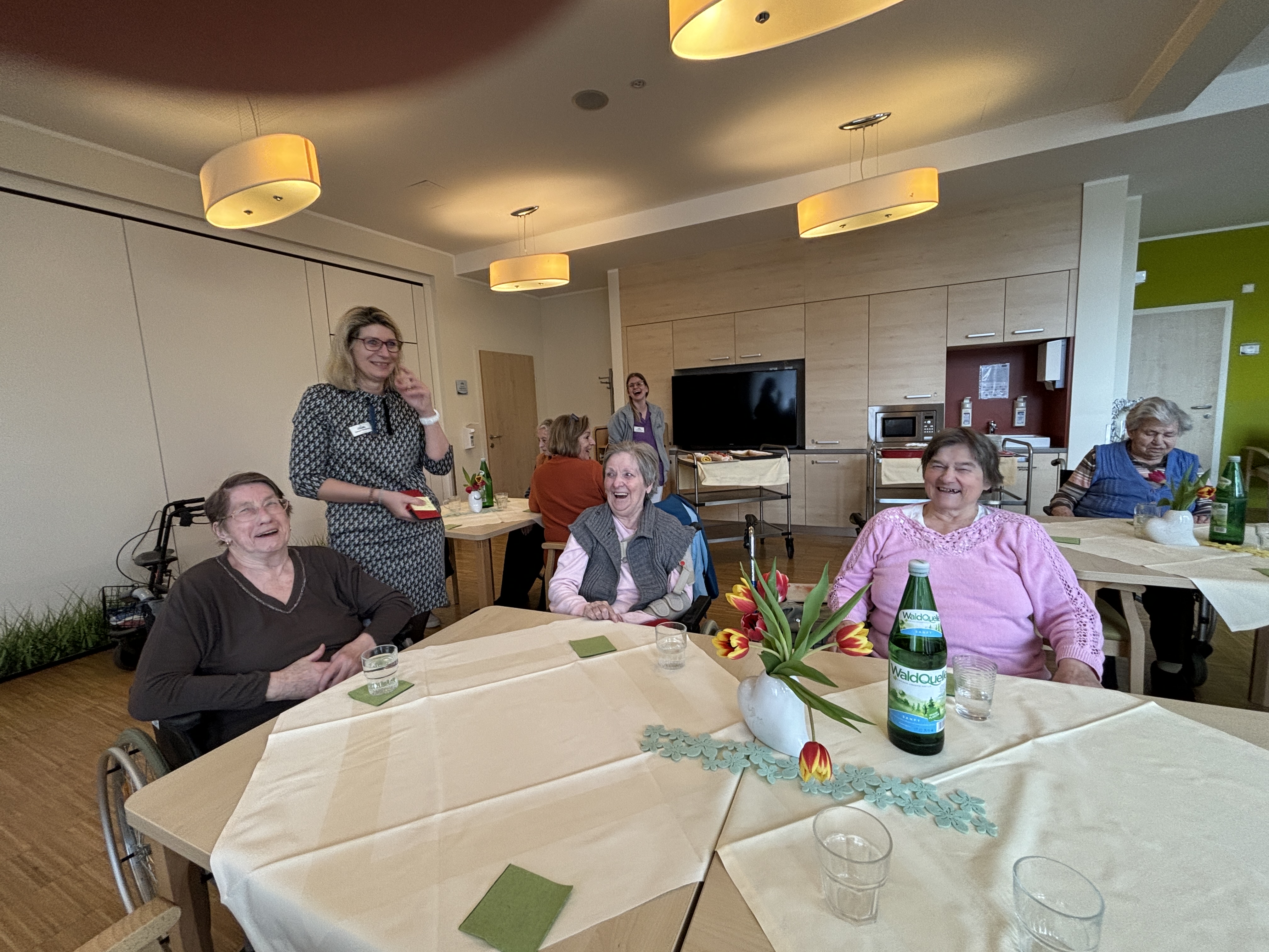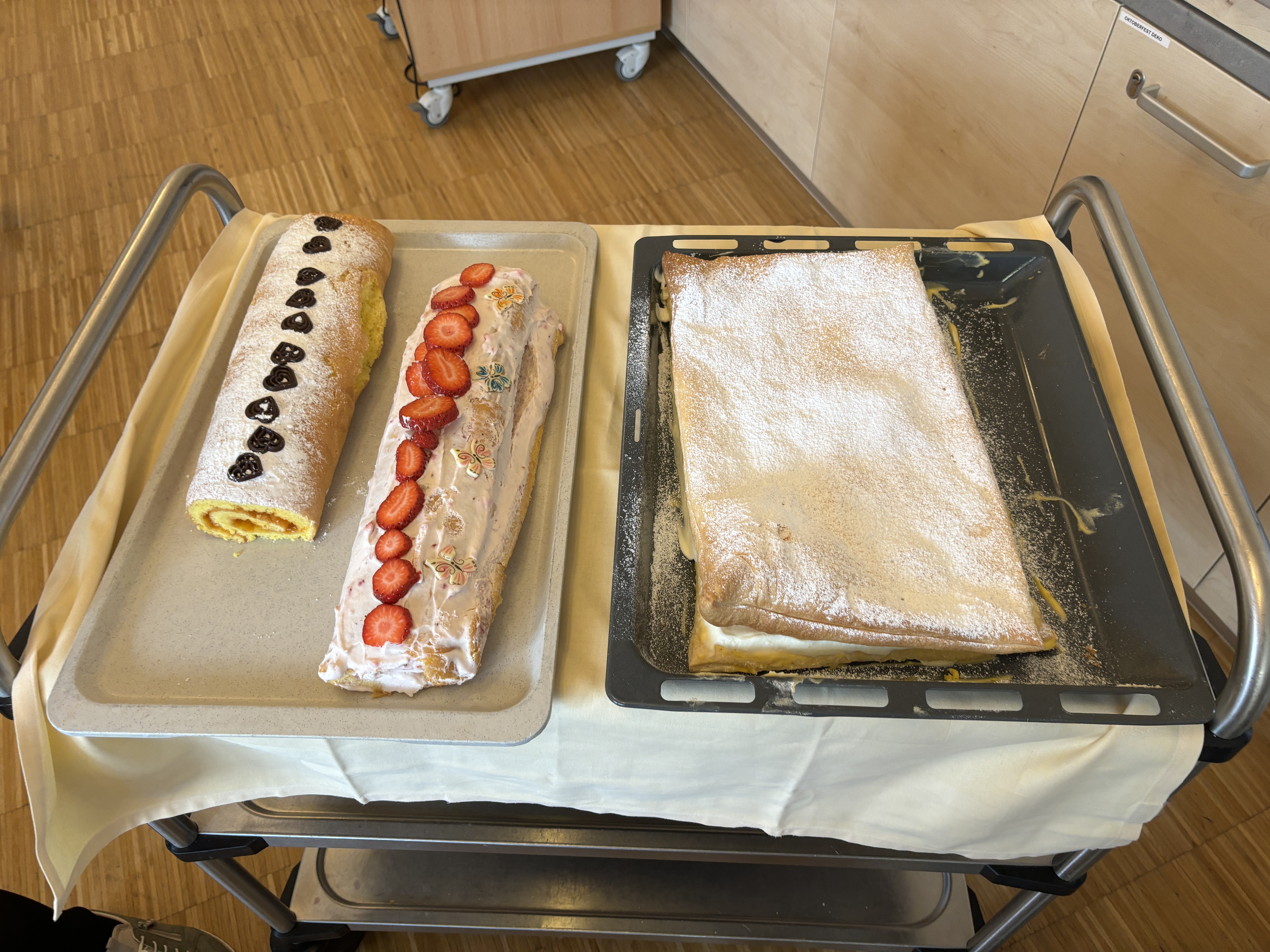 Die Damen der wöchentlichen Koch- und Backgruppe des SeneCura Sozialzentrums Kirchberg am Wechsel hatten diesmal gemeinsam mit der SB Ulli eine besondere Idee. Sie äußerten den Wunsch für ihre Angehörigen zu backen und anschließend ihre Lieben zu Kaffee und Kuchen einzuladen – und so kam es, dass die Bewohner:innen mit den Mitarbeiter:innen fleißig backten. Mit ganz viel Spaß und Liebe zum Detail wurde das Haus einen ganzen Tag lang zur Backstube umgewandelt. Die Rezepte wurden von den Bewohner:innen ausgesucht und der Duft von frisch gebackenen Cremeschnitten, Rouladen, Bananenschnitten, Gugelhupf und vielem mehr verbreitete sich im ganzen Haus. Am nächsten Tag wurden die Köstlichkeiten den Angehörigen und den Bewohner:innen mit Kaffee serviert. Nicht schlecht staunten alle, als sie die Meisterwerke sahen. Hausleitung Elisabeth Windbichler war natürlich auch anwesend und auch ihr schmeckten die selbstgemachten Mehlspeisen besonders gut. „Das war wirklich eine gute Idee und ein sehr gemütliches Beisammensein.“, so HL Elisabeth Windbichler. Ein großes Lob gilt den Damen von der Koch- und Backgruppe.