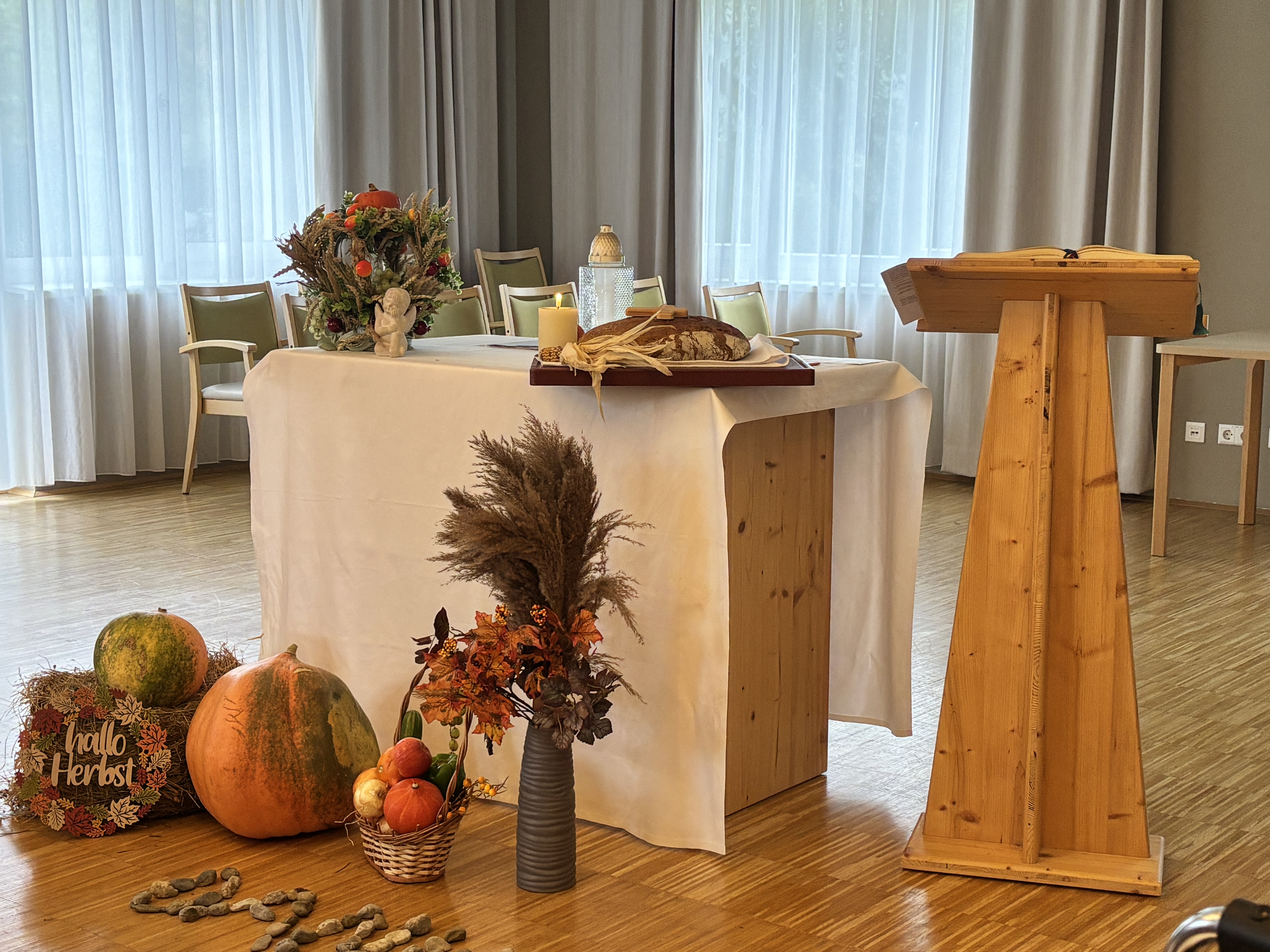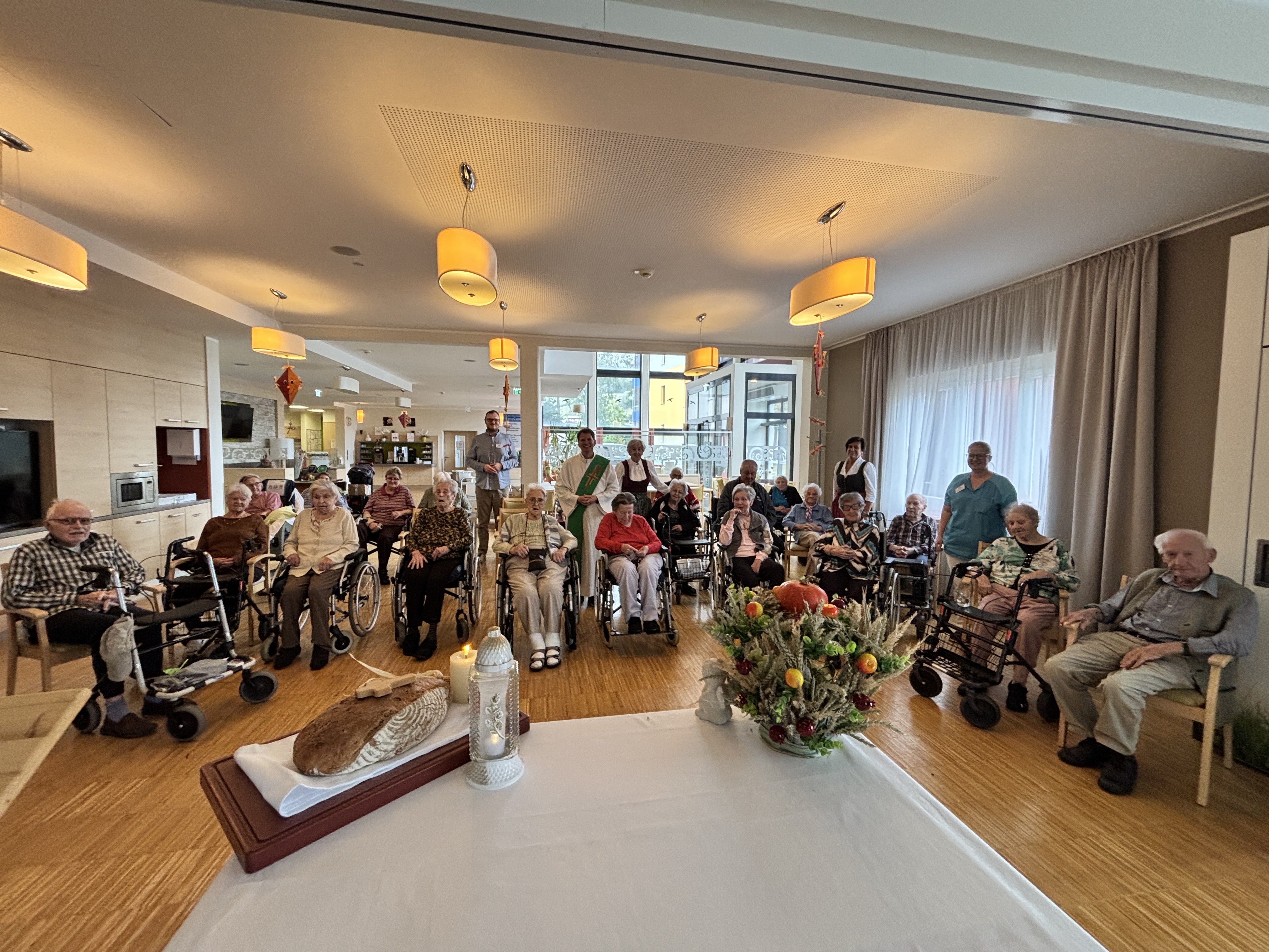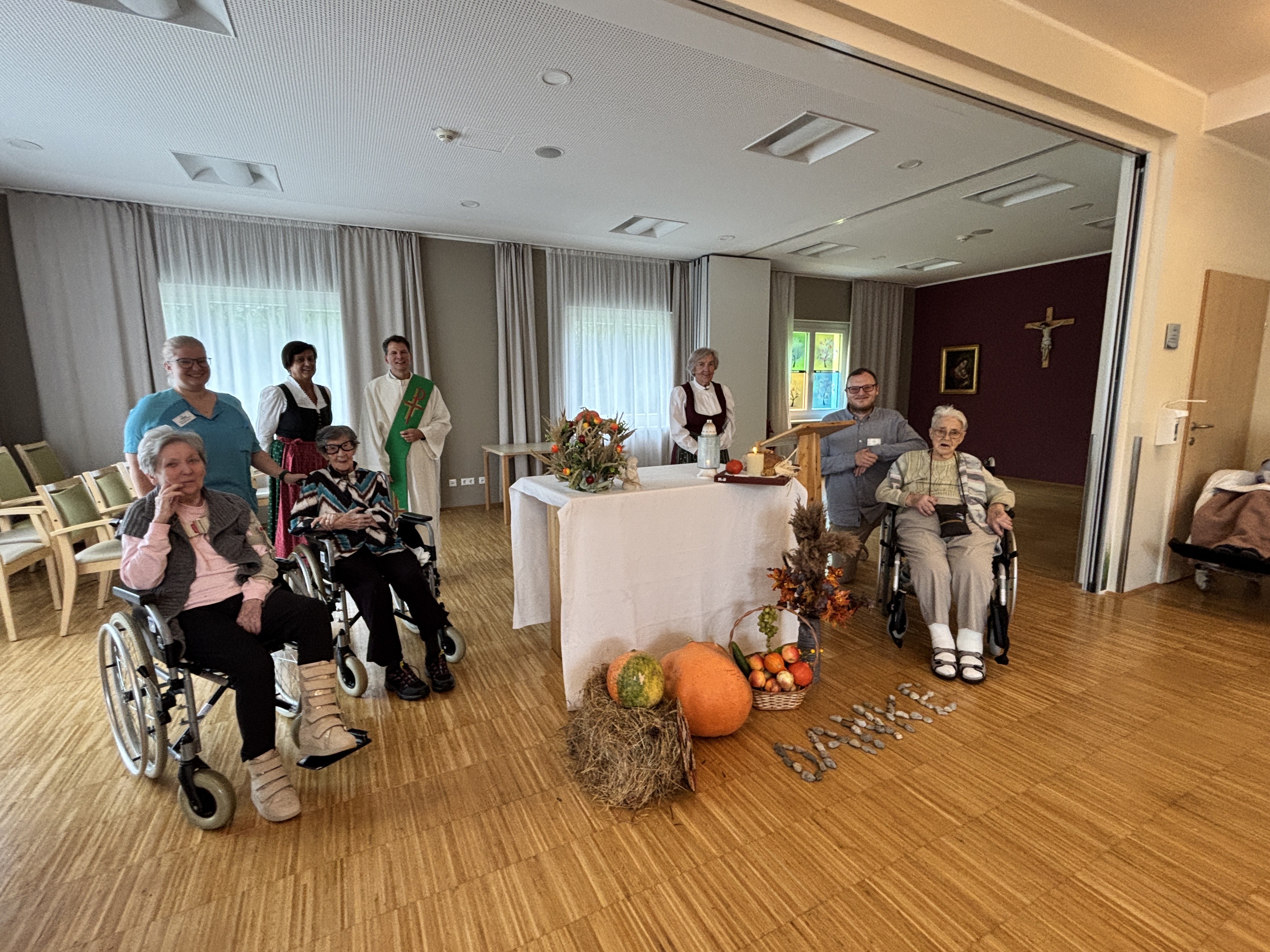 die Erntedankmesse besonders schön gefeiert. Die heilige Messe wurde von Diakon Thomas Burgstaller gelesen und die heiligen Schwestern von Katharinenkloster unterstützten bei der heiligen Messe. Außerdem wurde der Gottesdienst auch von einer Chorsängerin begleitet – dafür ein herzliches Dankeschön! Ein besonderer Dank gilt auch den ehrenamtlichen Mitarbeiterin, Maria Mathe, die dabei immer tatkräftig unterstützt. Der schön hergerichtete Altar erstrahlte dabei in vollem Glanz und auch das selbstgebackene Brot wurde selbstverständlich geweiht. Nach der Messe wurde dann gemeinsam mit Hausleitung Christian Sonnleitner die köstliche Kürbissuppe genossen. „Was für ein wunderschönes Fest Erntedank doch ist!“, schwärmten die Bewohner:innen des Hauses. „Ein Fest des Dankes!“, so meinte die Bewohnerin Elisabeth Gruber.