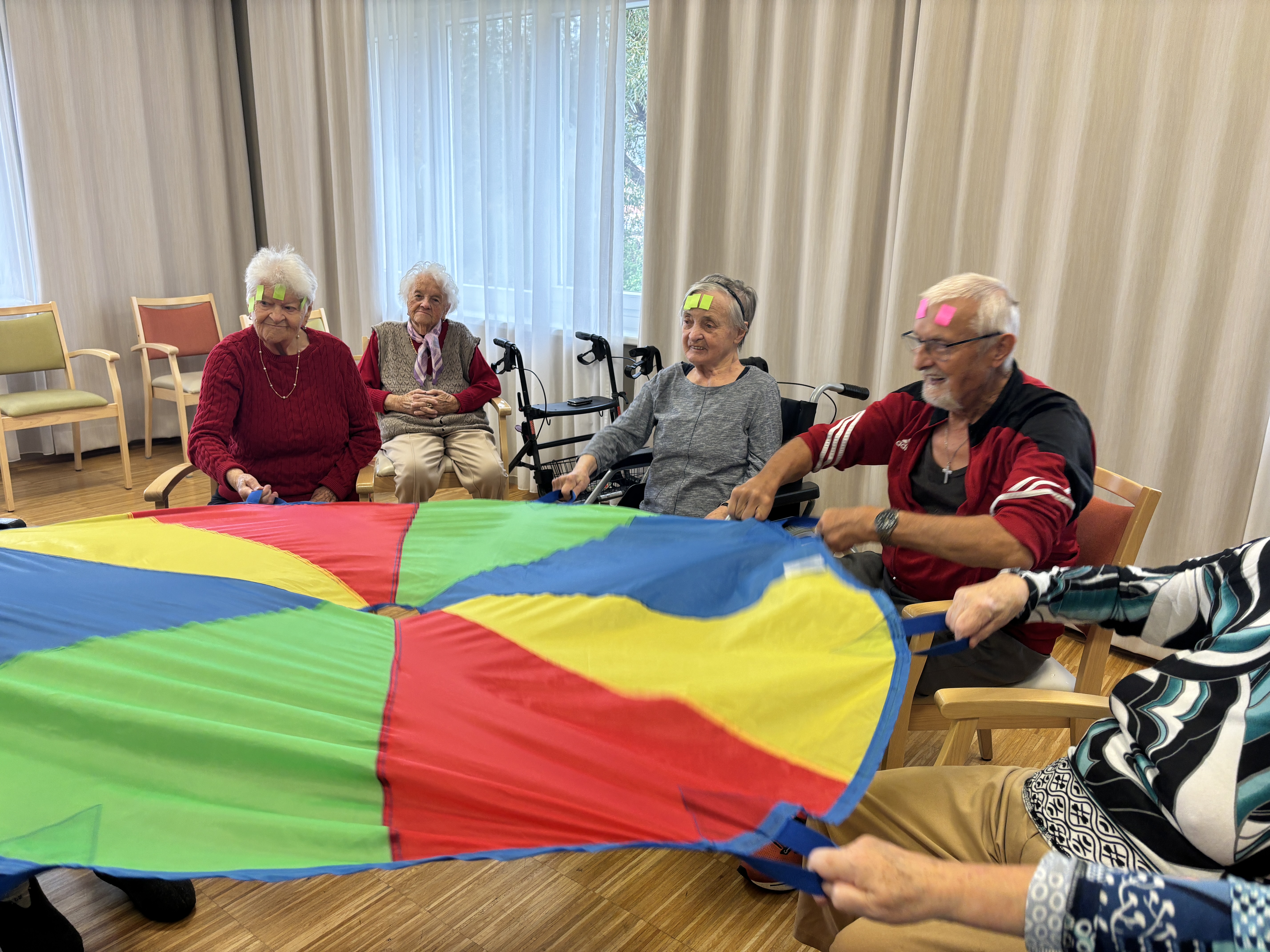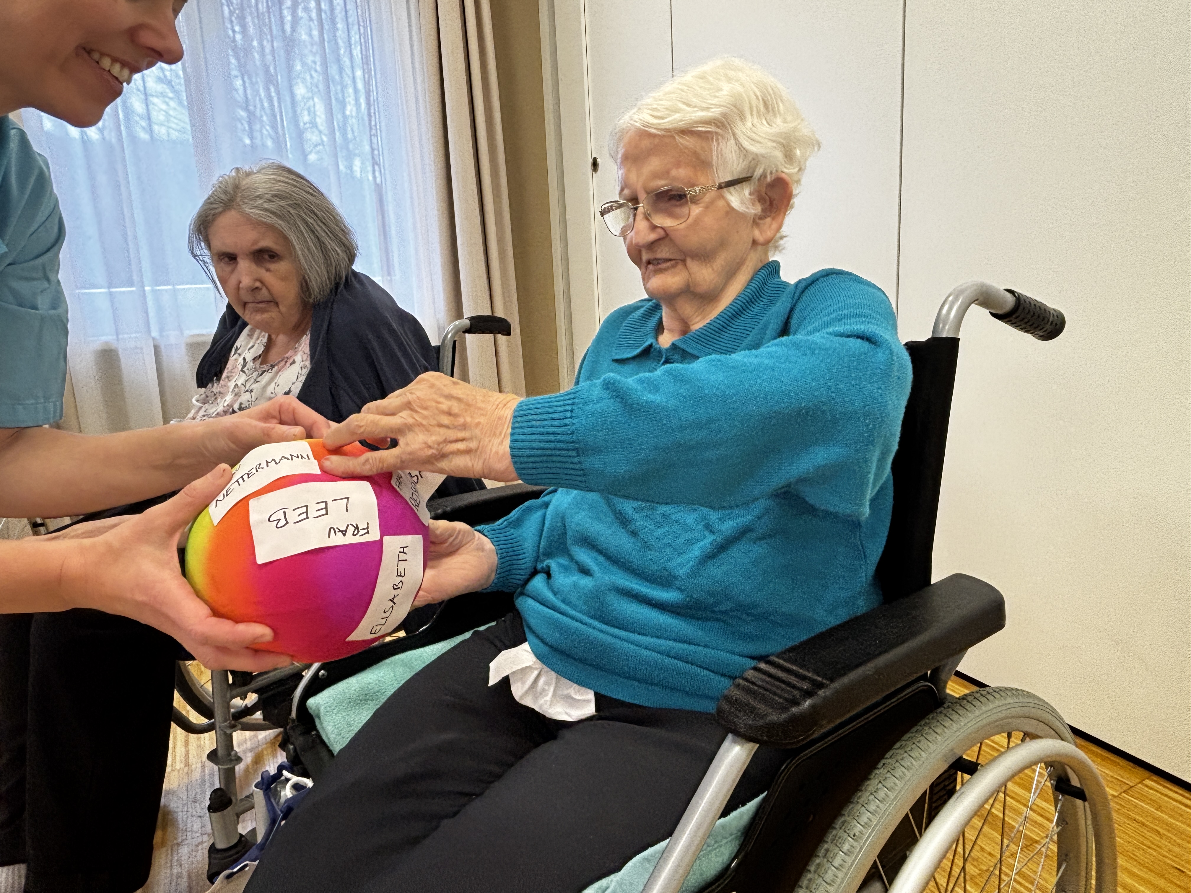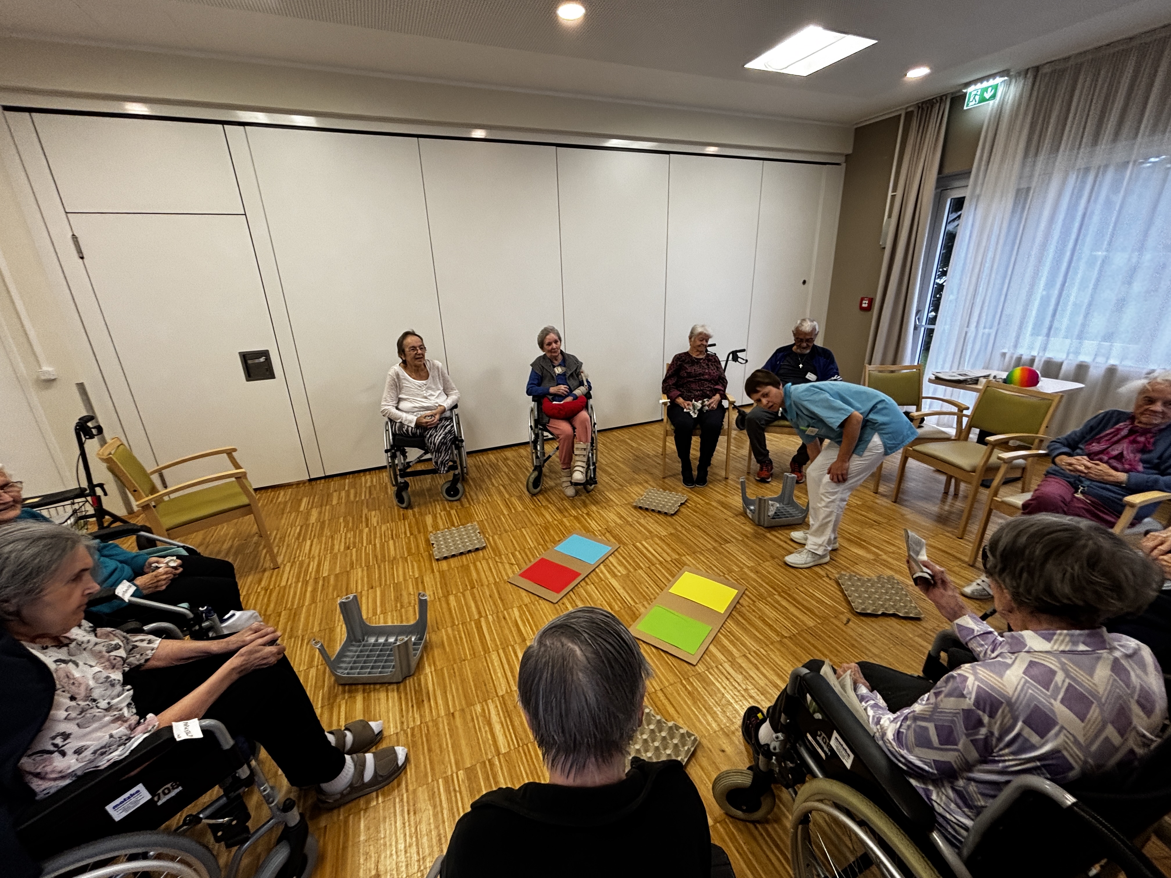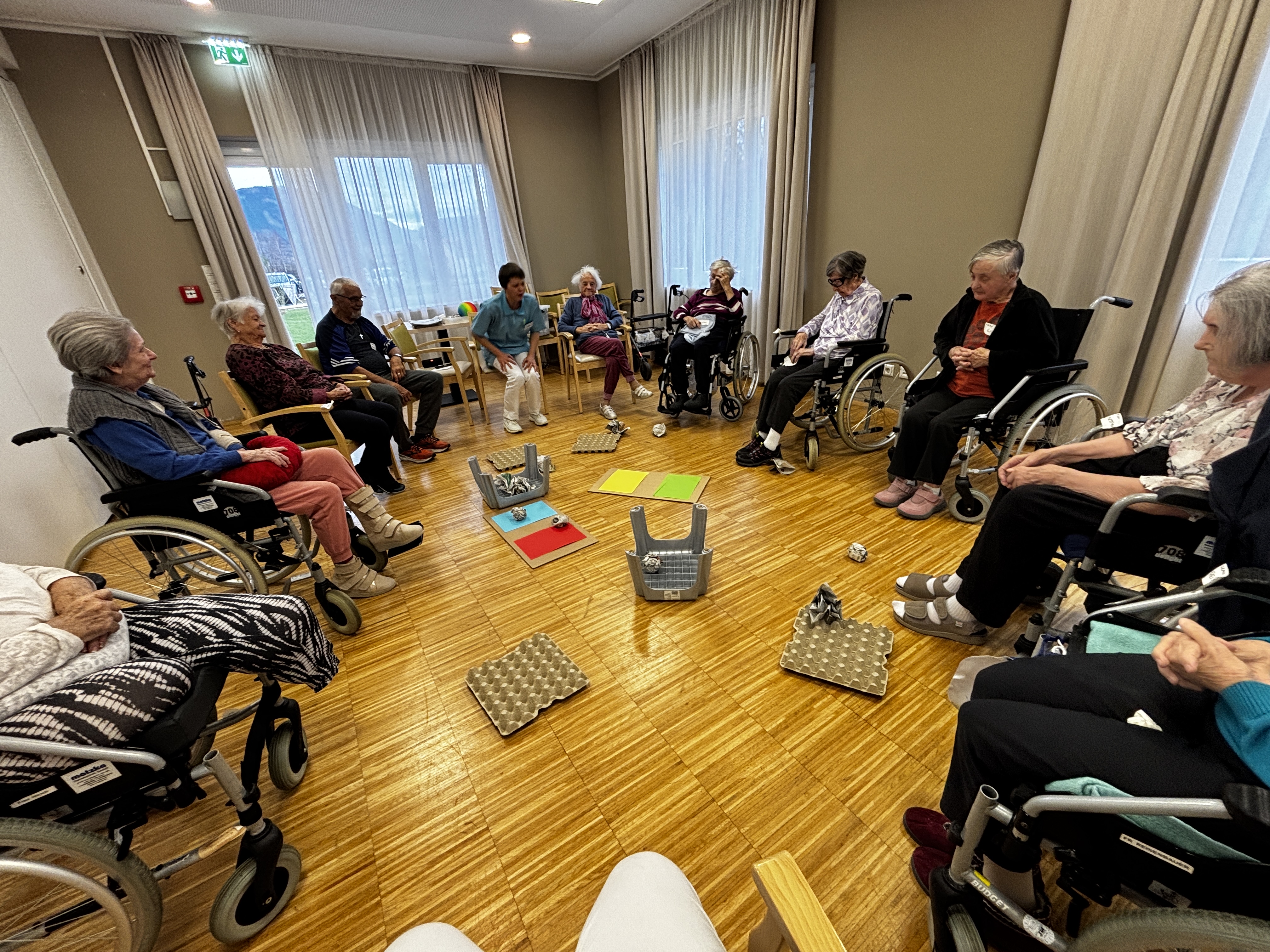 Die wöchentlichen Bewegungsrunden im SeneCura Sozialzentrum Kirchberg am Wechsel gestalten sich jedes Mal ein wenig anders – so wird des Öfteren mit dem „Merkball“ gespielt, wo auch gleichzeitig das Gedächtnis trainiert wird. Ein anderes Mal wird das beliebte Schwungtuch dazu genommen, was sich immer als äußerst lustig erweist, wenn die Punkte auf der Stirn verteilt werden, bei denjenigen die den Ball fallen lassen. Auch werden viele andere Materialien verwendet, die auch gleich den Spürsinn und Tastsinn fördern. So wurden unter anderem Zeitungsbälle geworfen und Eierkartons als Zielscheibe genutzt. Die Runde wird von Mal zu Mal größer und die Bewohner:innen freuen sich jedes Mal auf die Stunde.