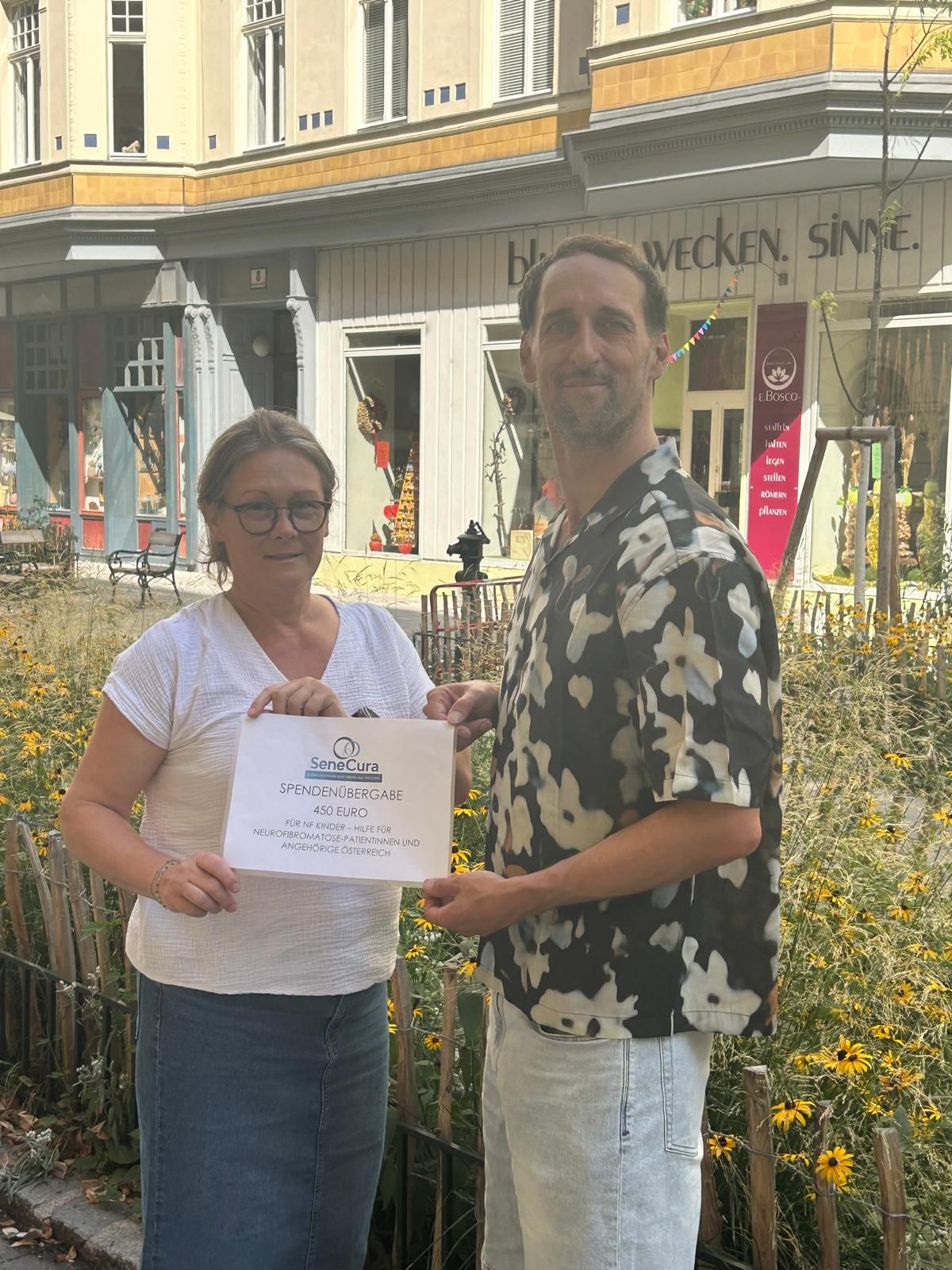 Der Einsatz hat sich gelohnt: Gemeinsam mit den Spenden unserer Mitarbeiter:innen kam die beeindruckende Summe von insgesamt 450,00 Euro zusammen. Diese wurde am 14. August 2025 von unserer Wohnbereichsleitung an die Organisation NF Kinder übergeben.