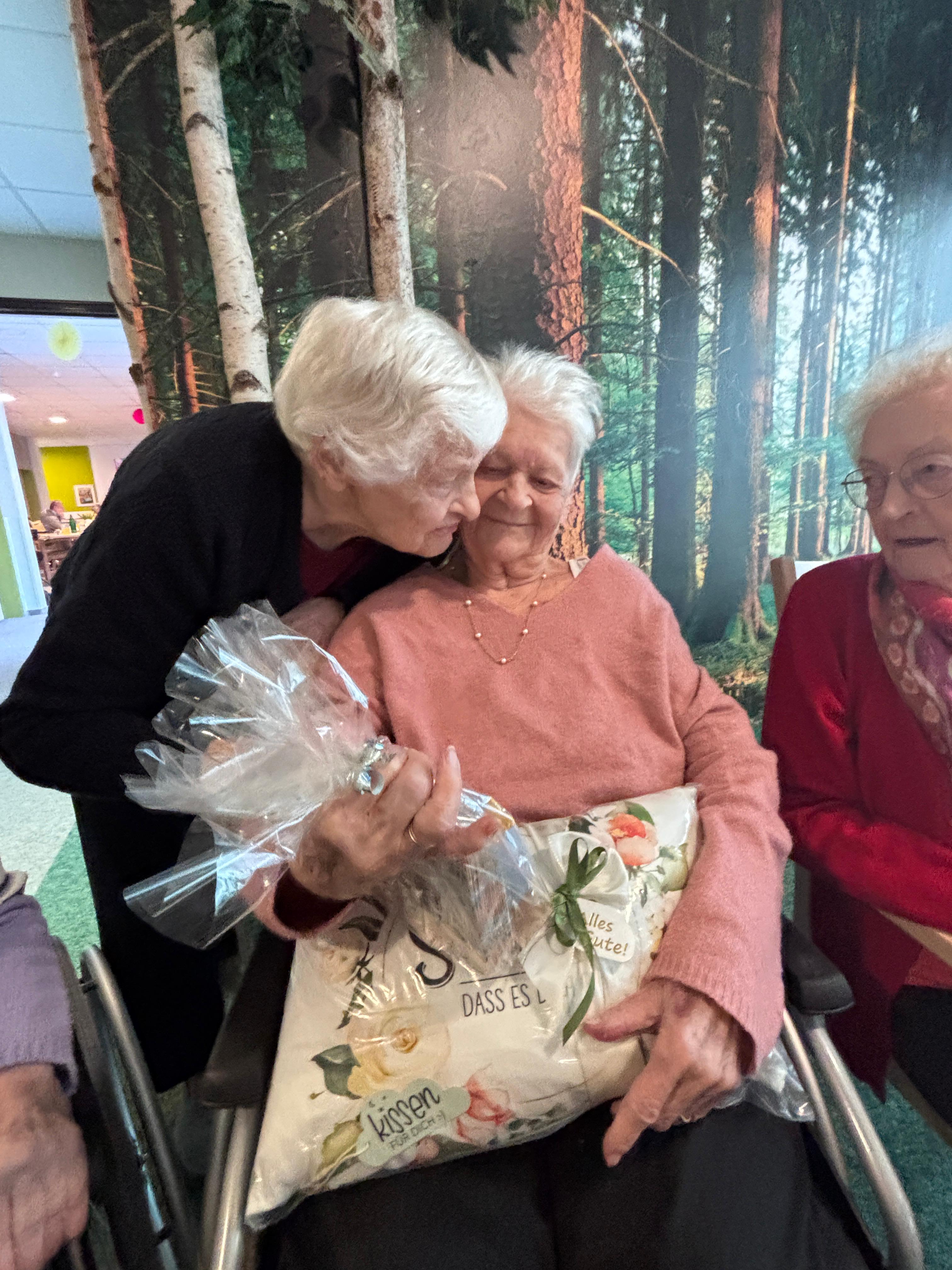 Wir haben das Glück, den 91. Geburtstag unserer lieben Bewohnerin zu feiern! Ihre Sitznachbarinnen haben ihr ein wunderschönes Geschenk überreicht – eine wunderbare Geste, die zeigt, dass im Pflegeheim echte Freundschaften fürs Leben entstehen.